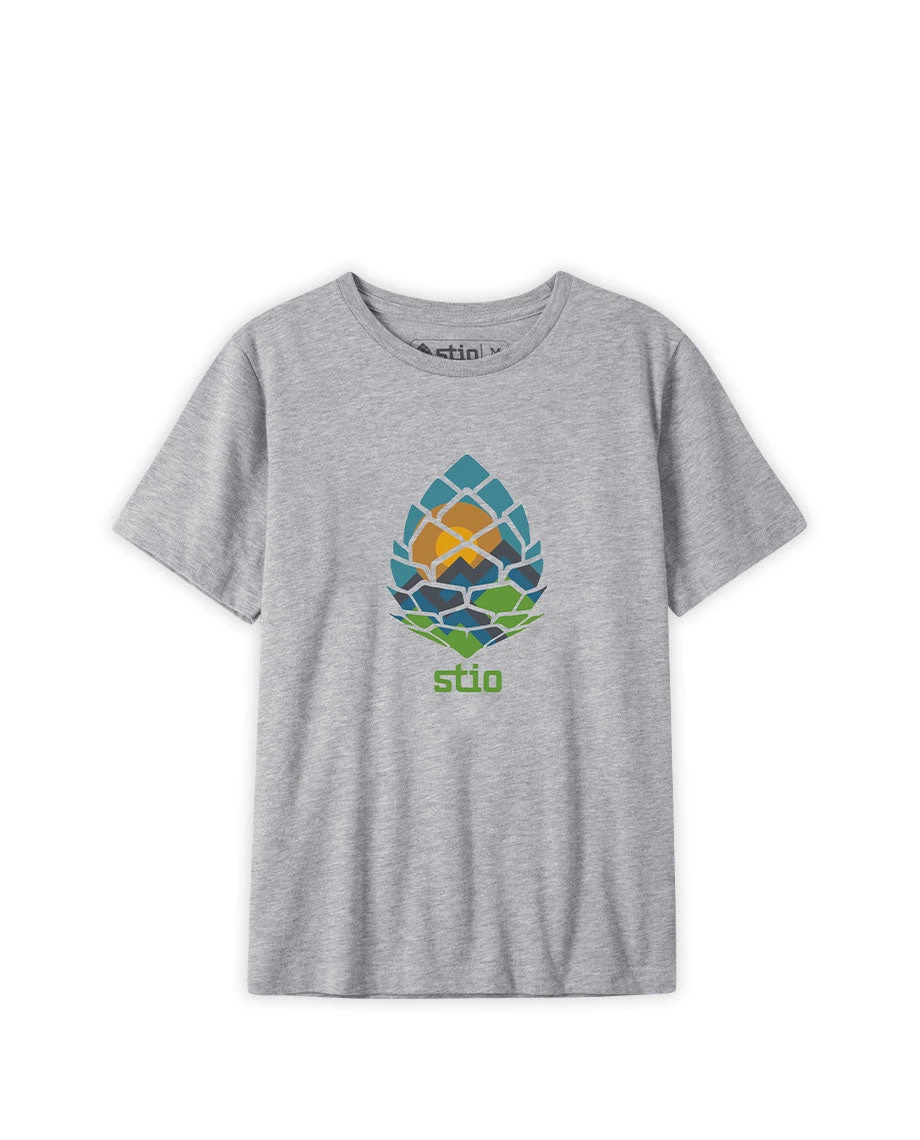 The sun rising over the mountains seen in a whitebark pinecone globe printed on a super soft tee. The whitebark pinecone is an important cog in the greater Yellowstone ecosystem.